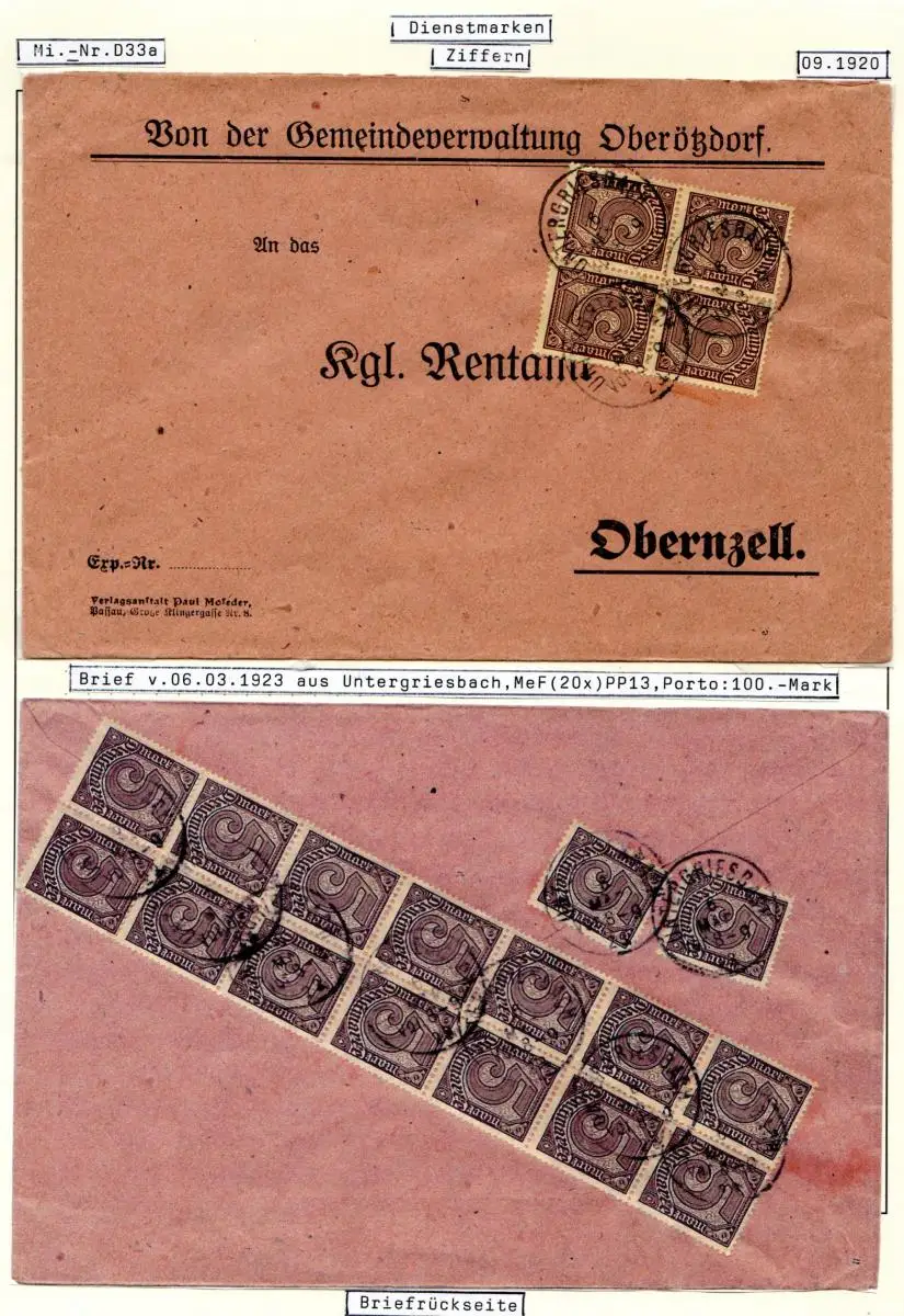 DR 1923, MeF Massenfrankatur 20x5 Mk. vorder-u. rs. auf Brief v. Untergriesbach