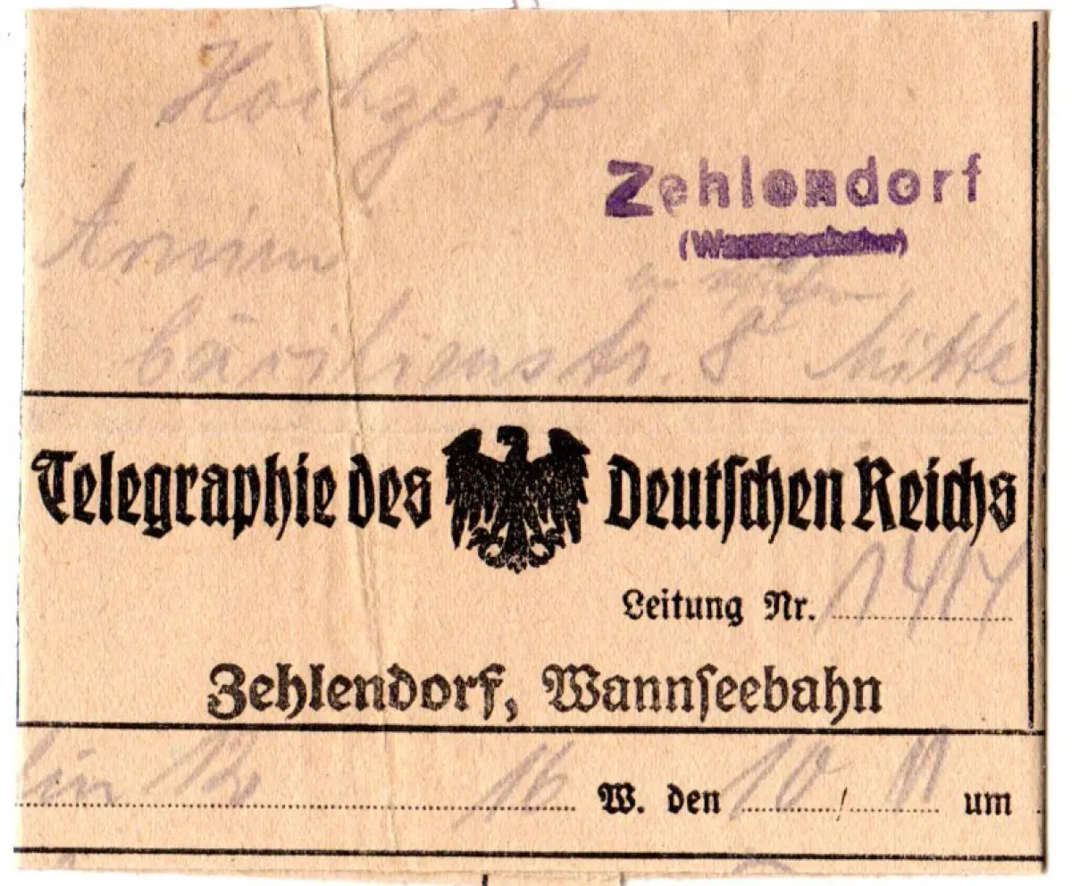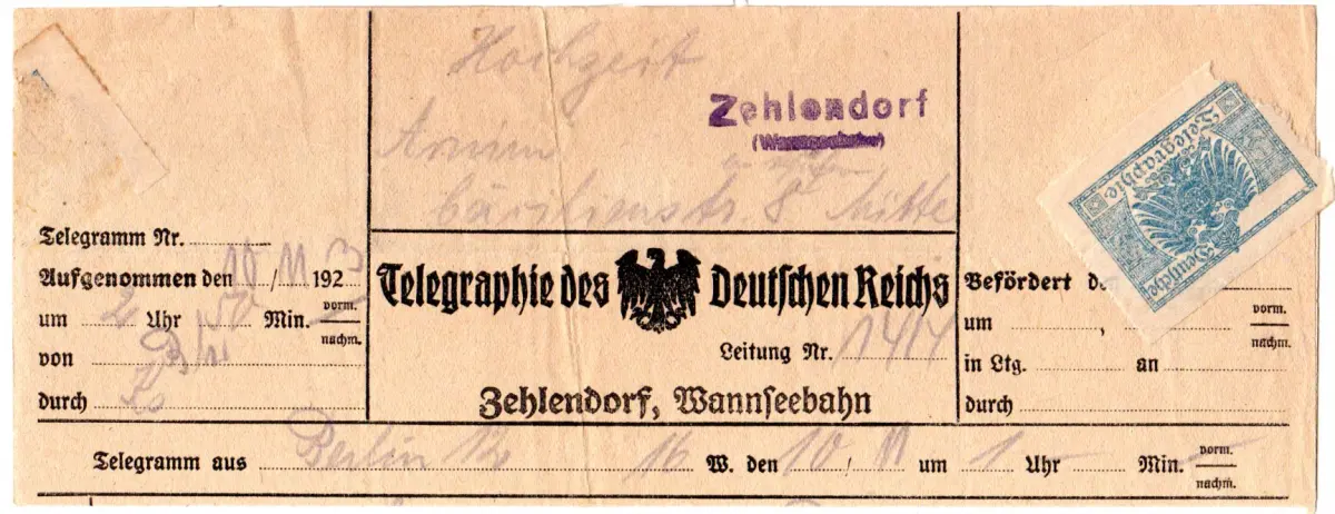 DR 1923, viol. L2 Zehlendorf (Wannseebahn) auf Telegramm aus der Hochinfla-Zeit