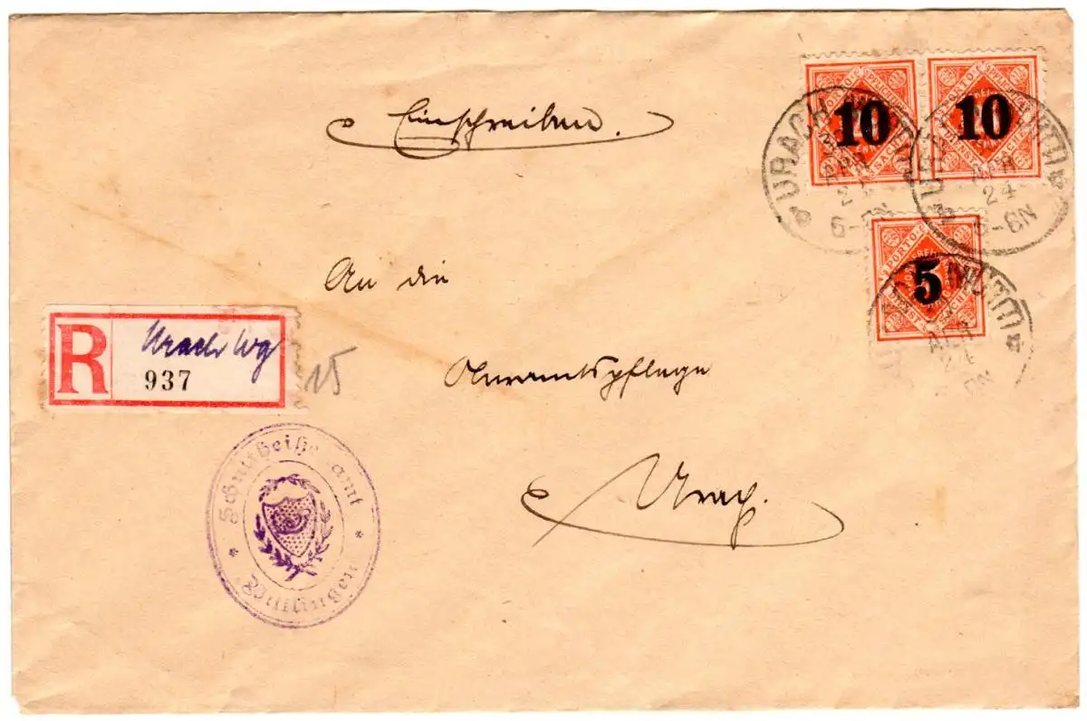 DR 1924, 5+2x10 Pf. Dienst auf Brief v. Wittlingen m. hds. Urach Reko-Zettel
