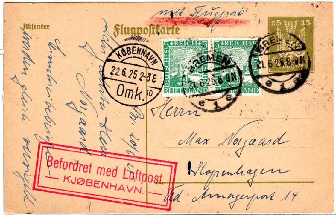 Bedarfsverwendete Ganzsache m. Zusatzfrankatur u. per Luftpost v. Bremen u. m. Kopenhagen Bestätigungsstempel
