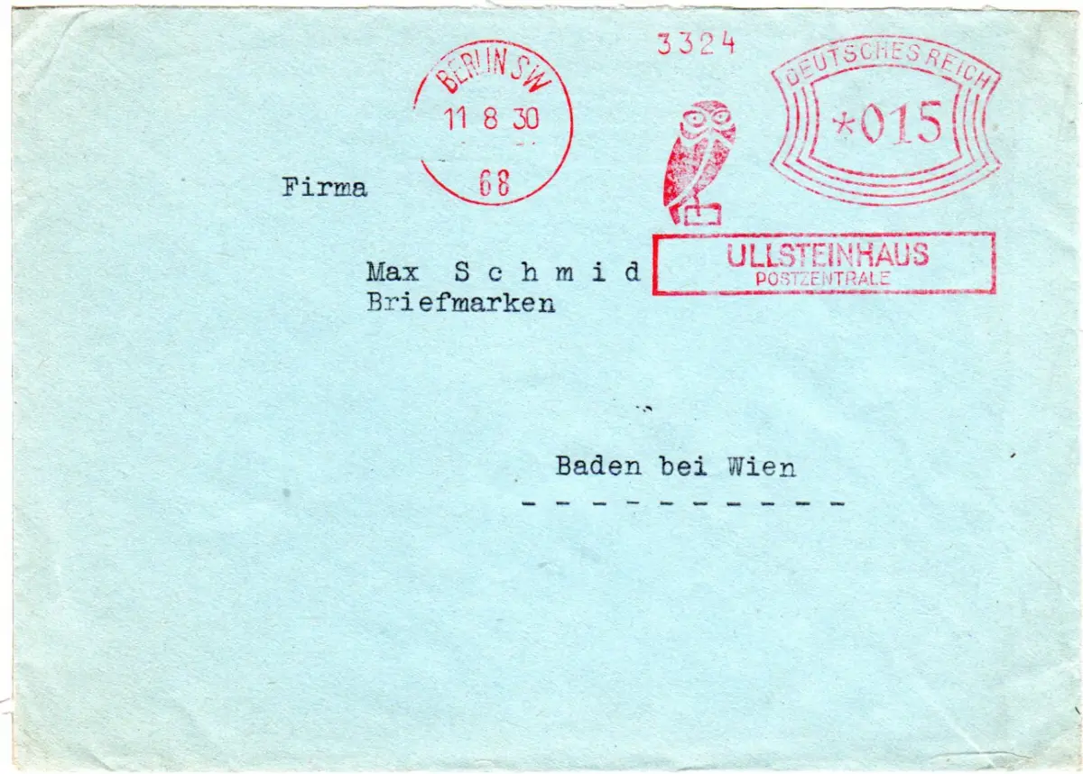 DR 1930, Fa. Ullsteinhaus AFSt. v. Berlin m. Abb. einer Eule