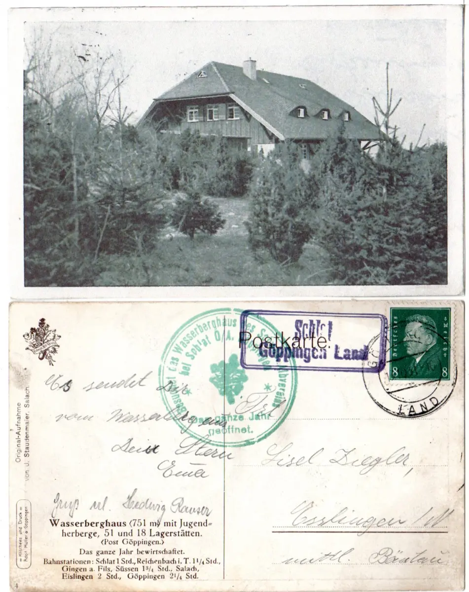 Poststellen II-Stempel auf sw-AK Wasserberghaus mit Jugendherberge.