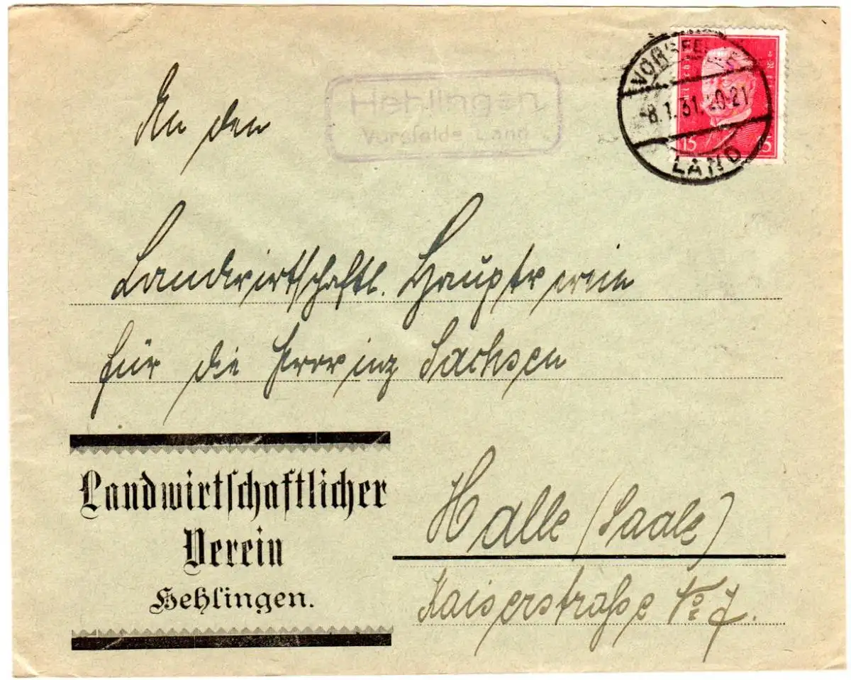 DR 1931, Landpoststpl. HEHLINGEN Vorsfelde Land auf Brief m. 15 Pf.