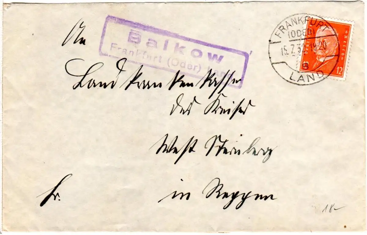 DR 1932, Landpost Stpl. BALKOW über Frankfurt (Oder) auf Brief m. 12 Pf