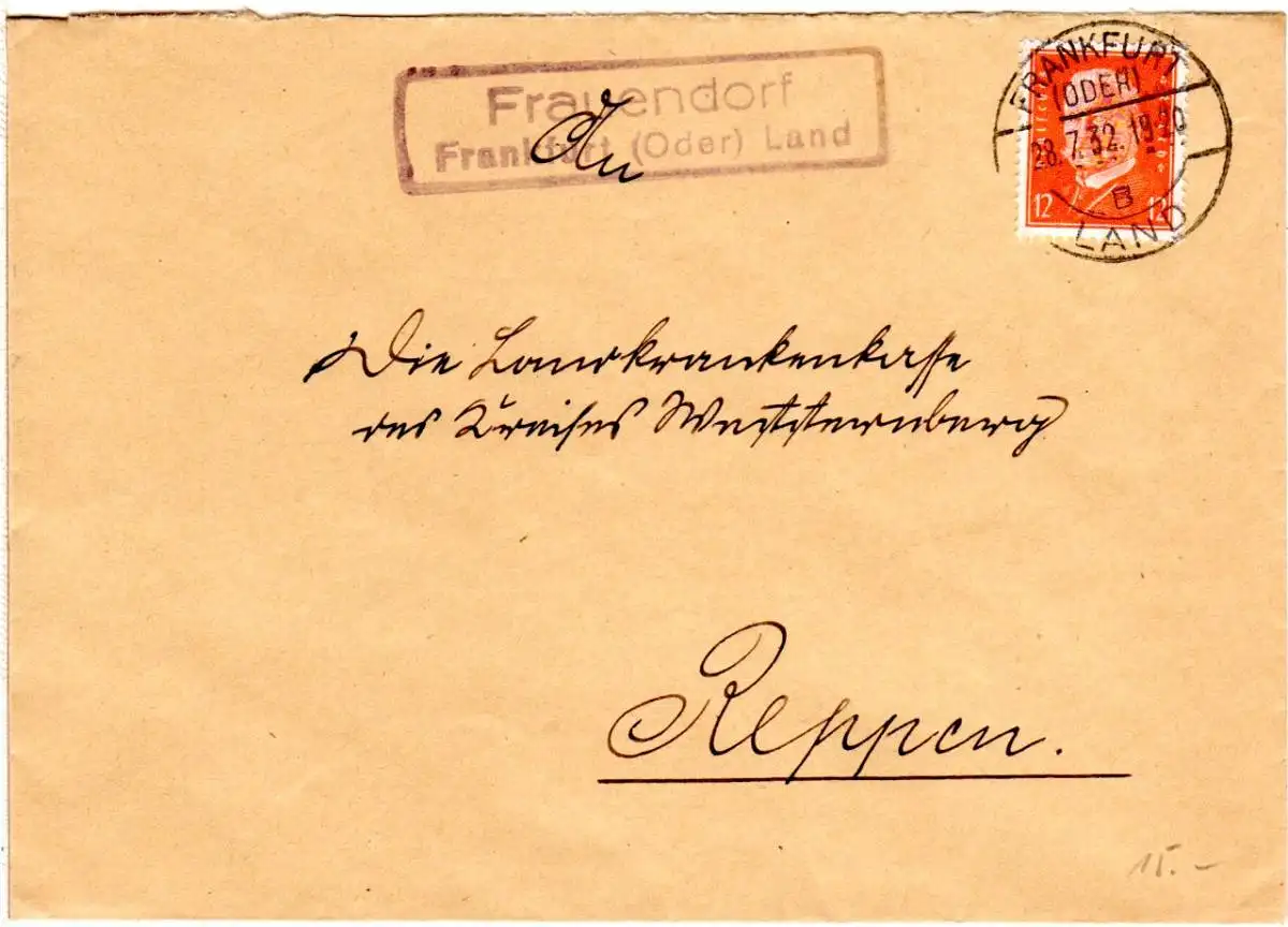 DR 1932, Landpost Stpl. FRAUENDORF über Frankfurt (Oder) auf Brief m. 12 Pf