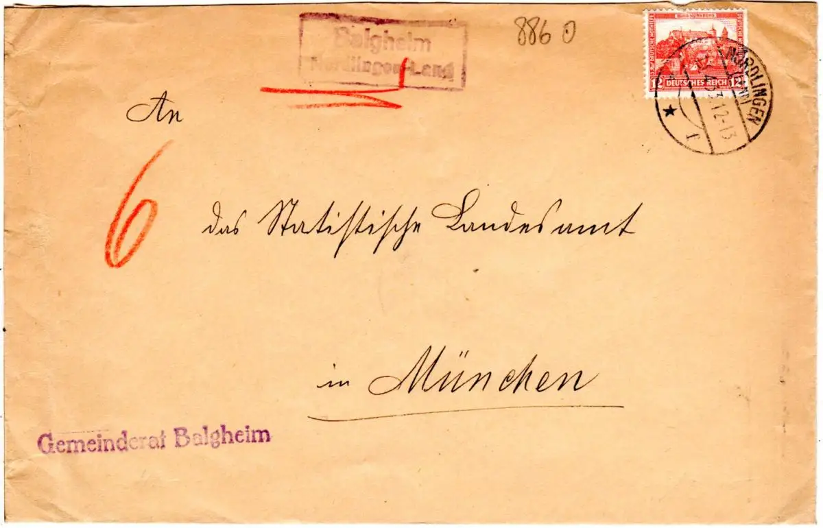 DR 1933, Landpost Stpl. BALGHEIM Nördlingen Land auf Gemeinde Brief m. 12 Pf.