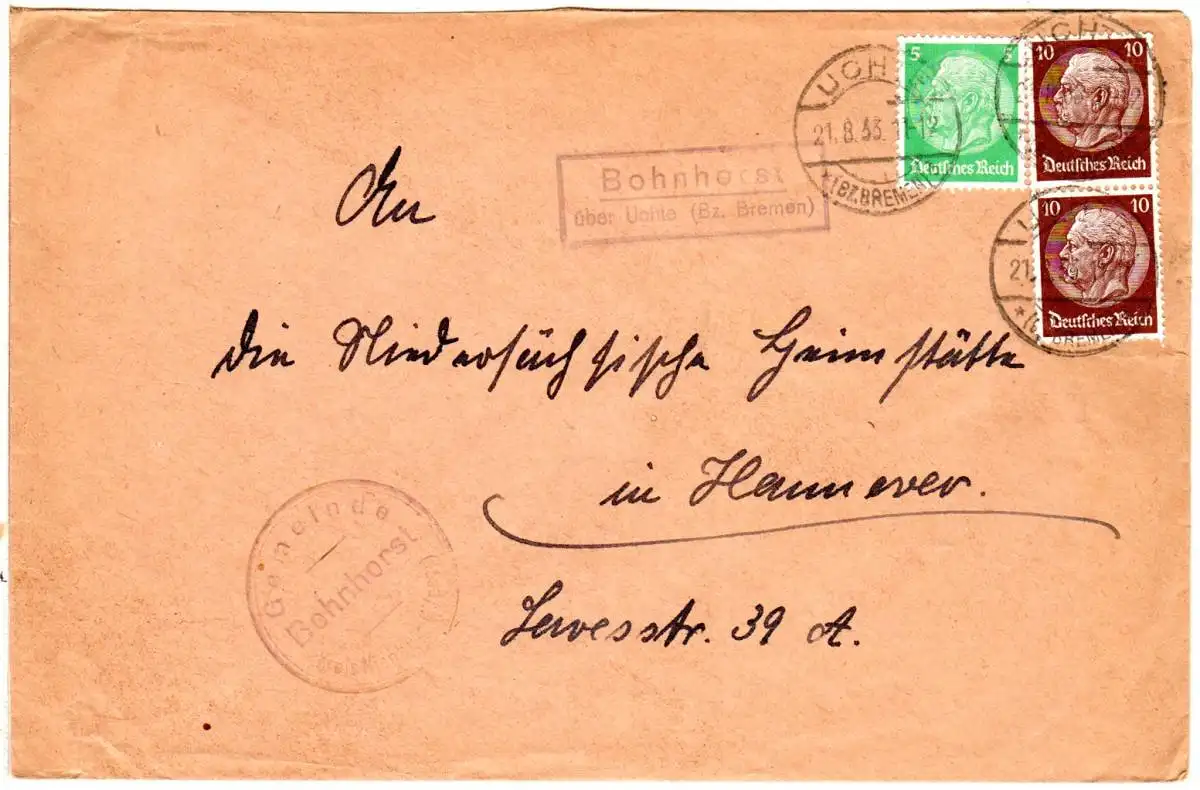 DR 1933, Landpost Stpl. BOHNHORST über Uchte (Bz. Bremen) auf Brief m. 2x10+5 Pf