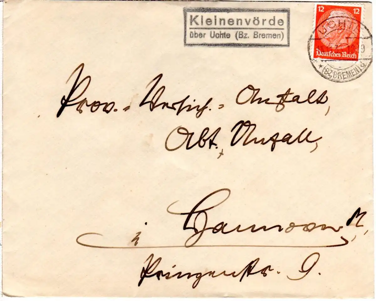 DR 1933, Landpost Stpl. KLEINENVÖRDE über Uchte (Bz. Bremen) auf Brief m. 12 Pf