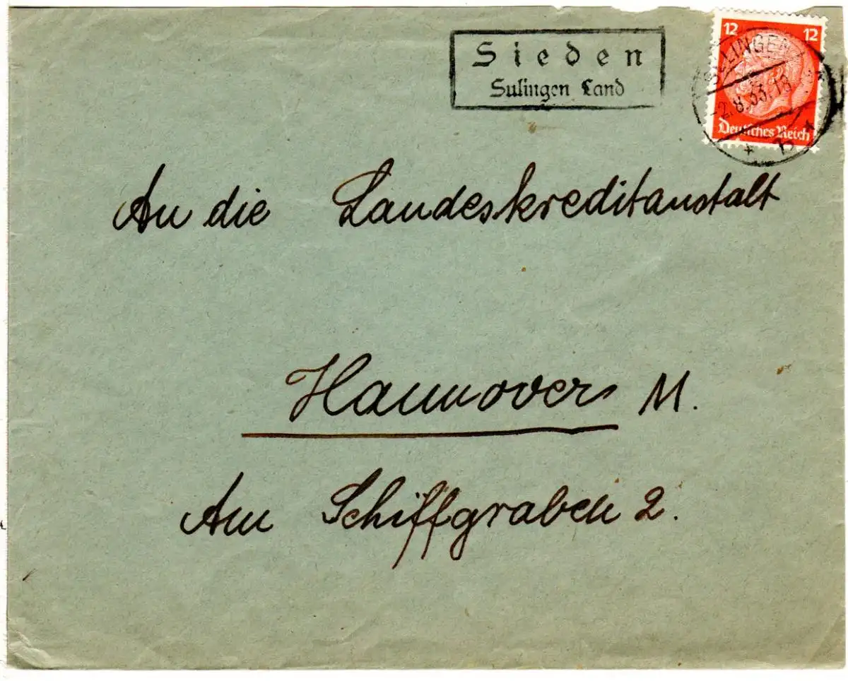 DR 1933, Landpost Stpl. SIEDEN über Sulingen Land auf Brief m. 12 Pf.