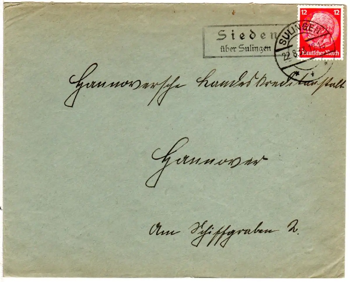 DR 1933, Landpost Stpl. SIEDEN über Sulingen auf Brief m. 12 Pf.