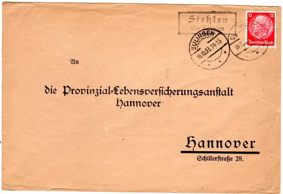 DR 1933, Landpost Stpl. STEHLEN über Sulingen auf Brief m. 12 Pf.