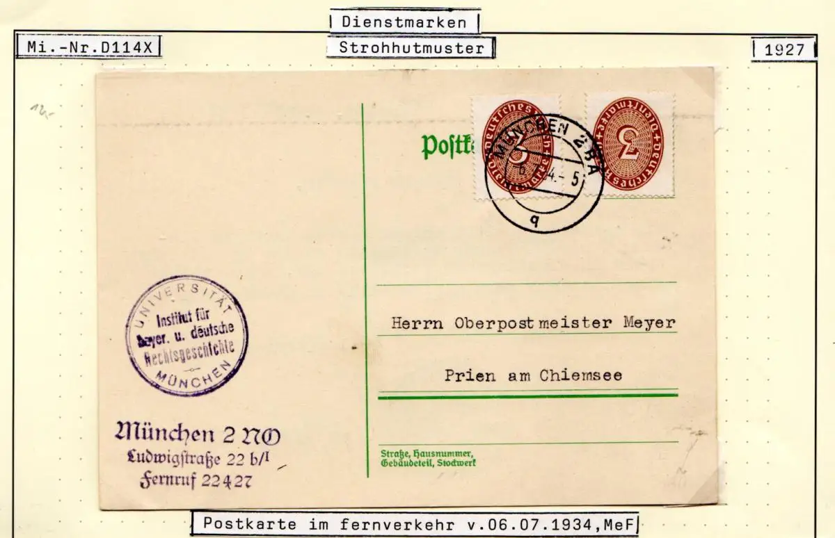 DR 1934, 2x3 Pf. Dienst auf Karte der Uni München, Institut f. Rechtsgeschichte