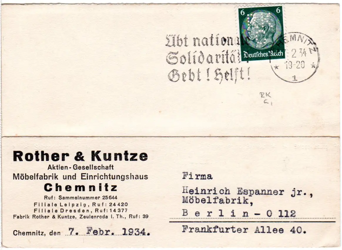 6 Pf. Hindenburg m. Firmenlochung RK C auf Firmenkarte Rother & Kuntze AG Möbelfabrik u. Einrichtungshaus, Chemnitz. Interessant auch f. Thematik Motiv Heim und Haus, Haishalt, Wohnen etc.