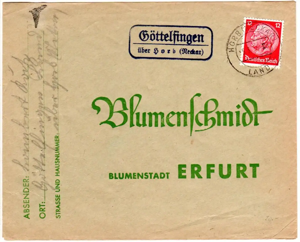 DR 1934, Landpost Stpl. GÖTTELFINGEN über Horb (Neckar) auf Brief m. 12 Pf.