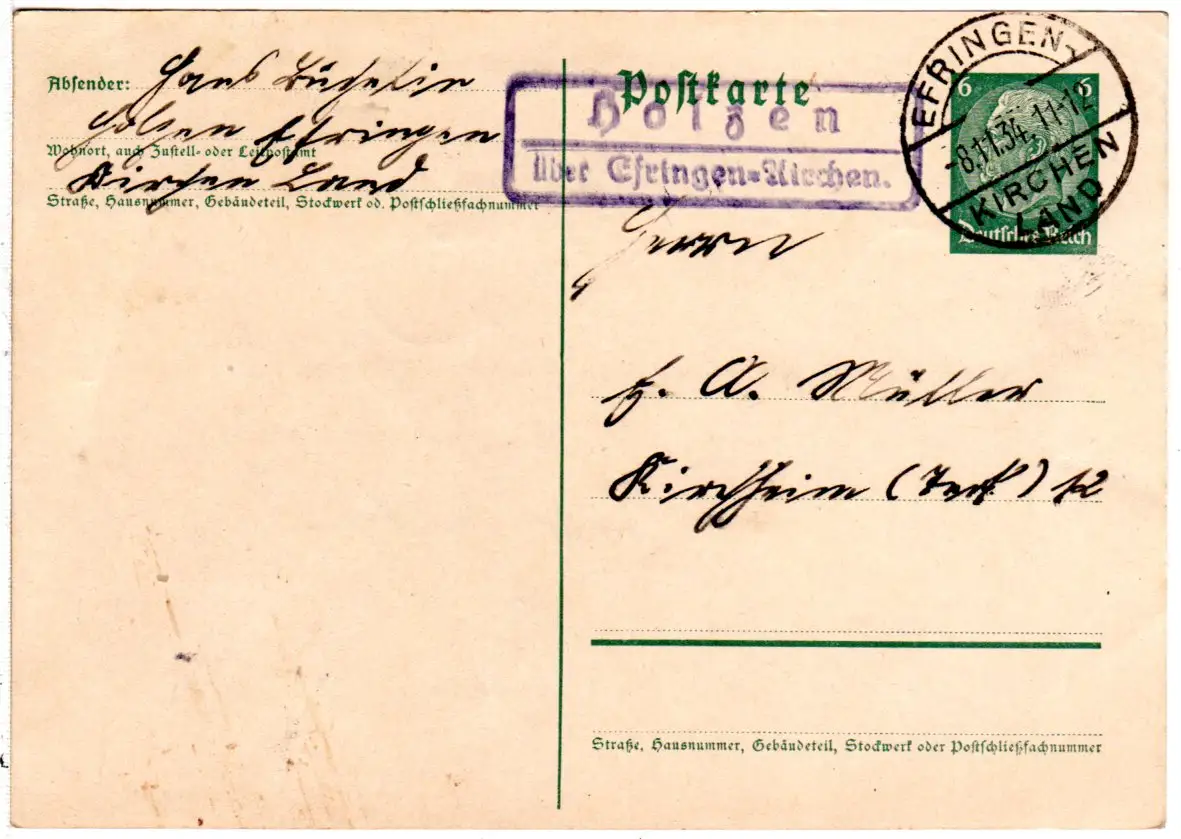 DR 1934, Landpost Stpl. HOLZEN über Efringen-Kirchen auf 6 Pf. Ganzsache