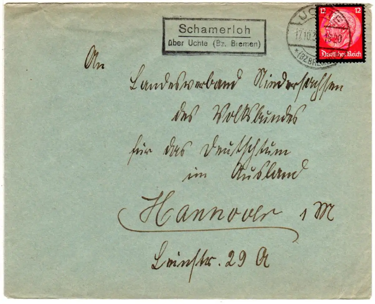 DR 1934, Landpost Stpl. SCHAMERLOH über Uchte (Bz. Bremen) auf Brief m. 12 Pf.