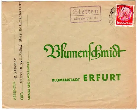 DR 1934, Landpost Stpl. Stetten über Mellrichstadt auf Brief m. 12 Pf.