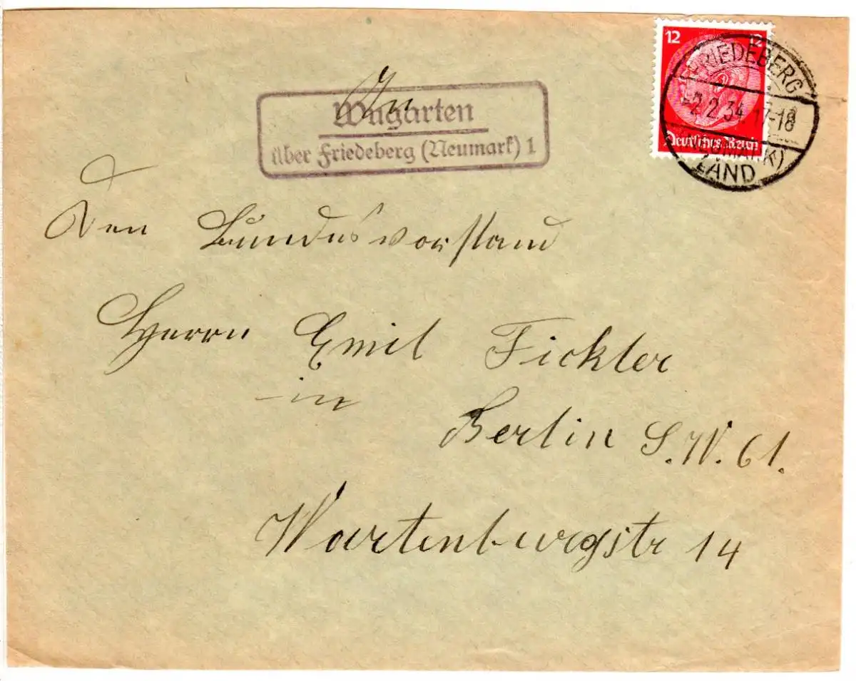 DR 1934, Landpost Stpl. WUGARTEN über Friedeberg auf Briefvorderseite m. 12 Pf.