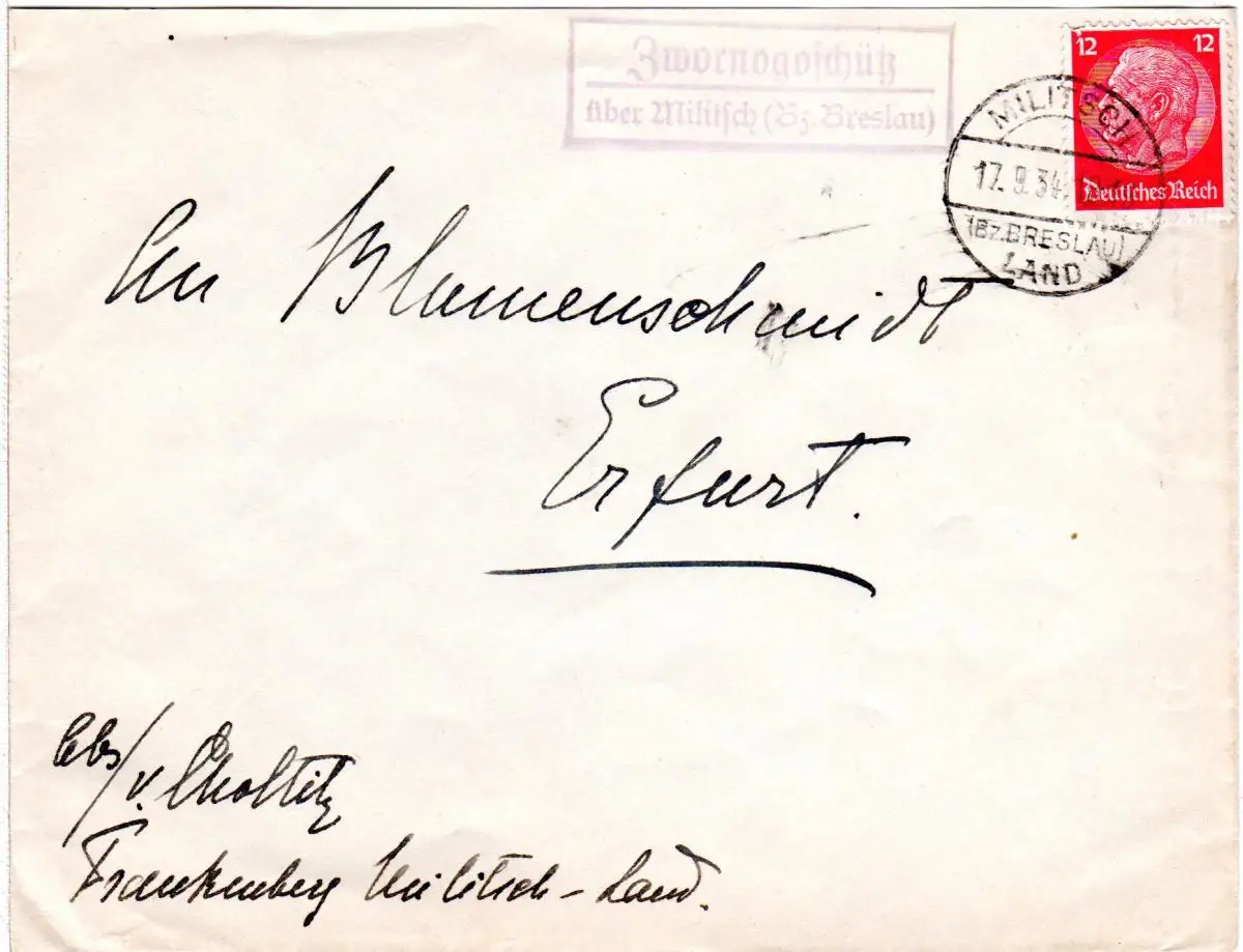 DR 1934, Landpost Stpl. ZWORNOGOSCHÜTZ über Militsch (Bz. Breslau) auf Brief