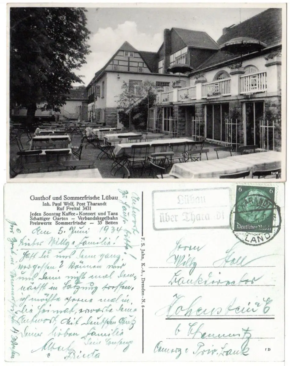 DR 1934, Landpoststpl. LÜBAU über Tharandt auf Gasthaus sw-AK m. 6 Pf.