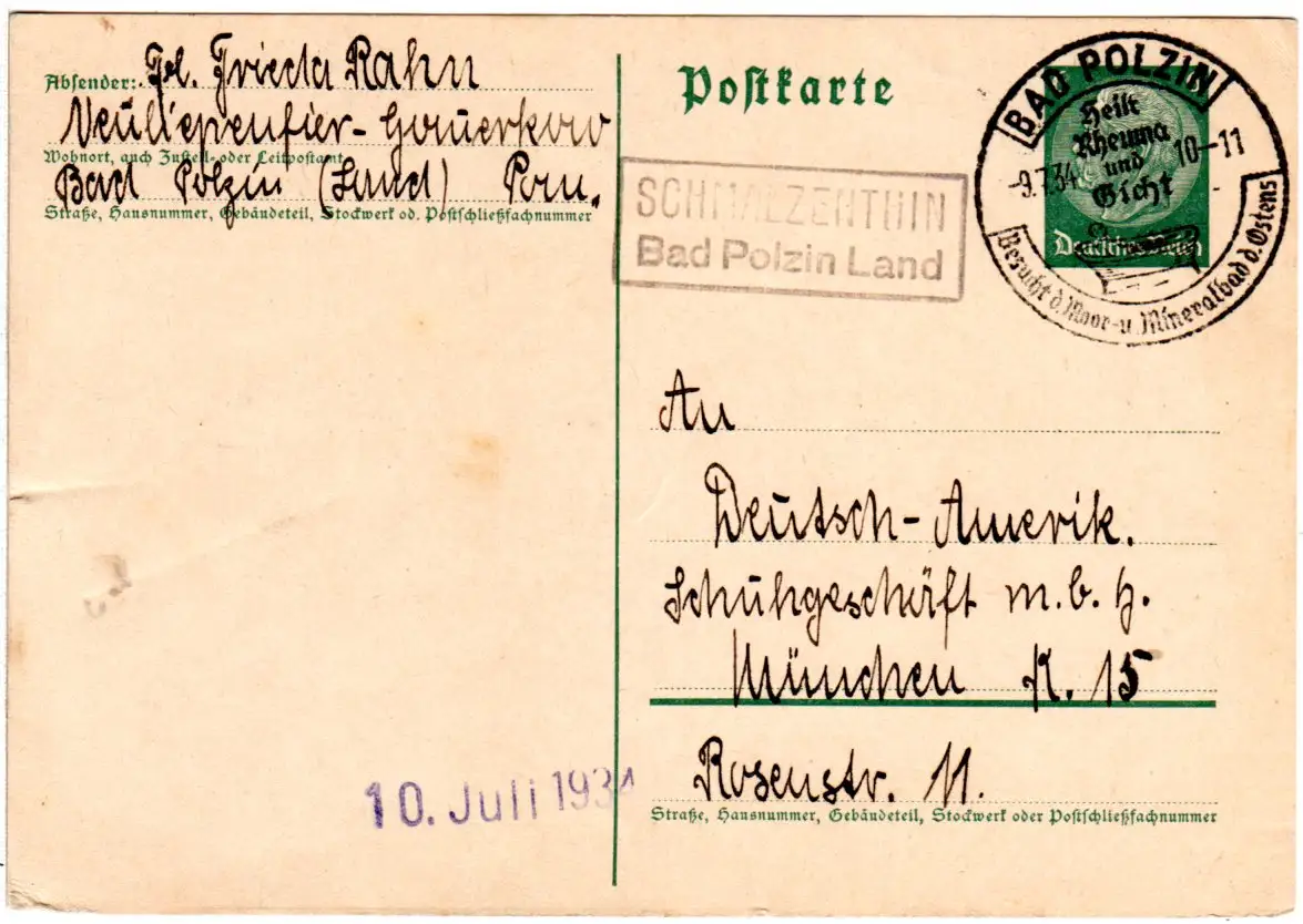 DR 1934, SCHMALZENTHIN Bad Polzin Land, Landpost Stpl. auf 6 Pf. Ganzsache
