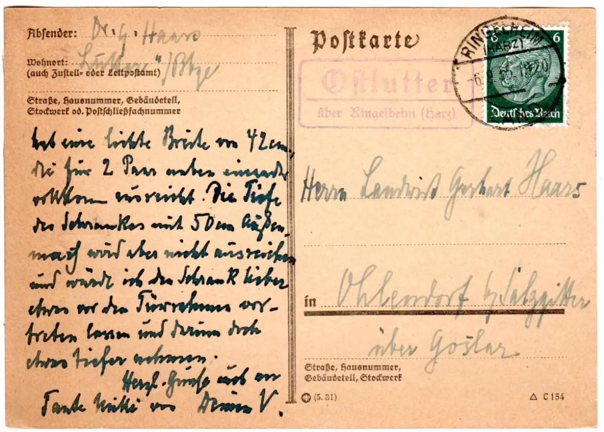 DR 1935, Landpost Stpl. OSTLUTTER über Ringelheim (Harz) auf Karte m. 6 Pf.