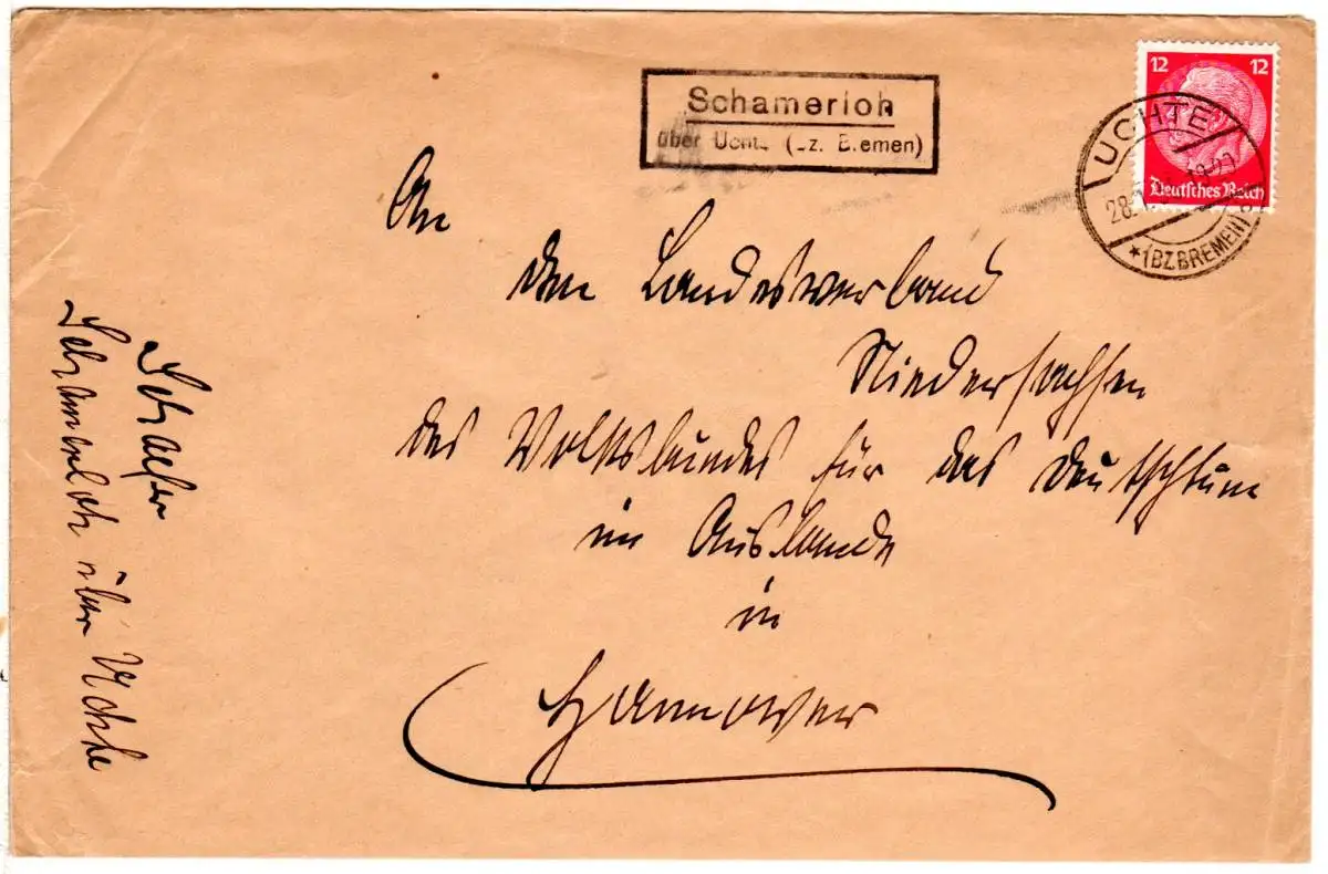 DR 1935, Landpost Stpl. SCHAMERLOH über Uchte (Bz. Bremen) auf Brief m. 12 Pf.
