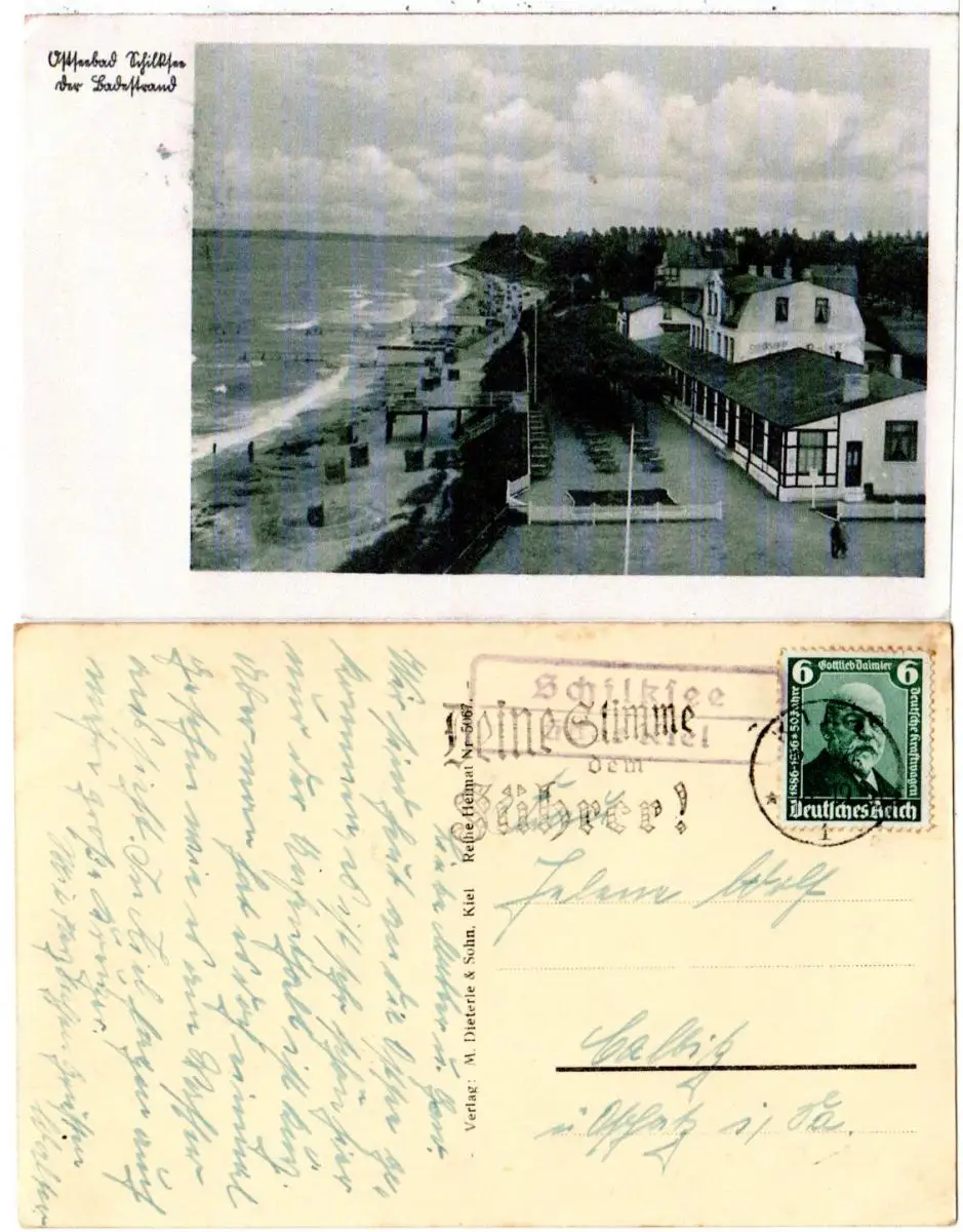 DR 1935, Landpost Stpl. SCHILTZSEE über Kiel auf sw-AK m. 6 Pf.