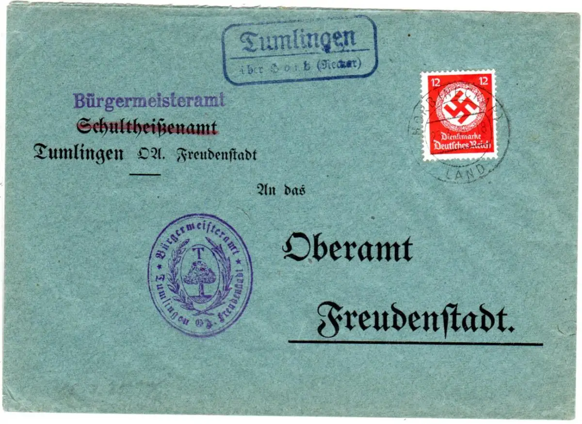 DR 1935, Landpost Stpl. TUMLINGEN über Horb auf Bürgermeister Brief m. 12 Pf.