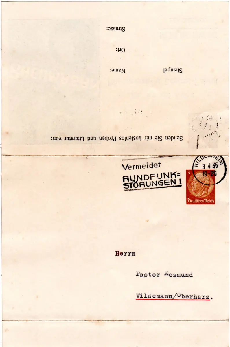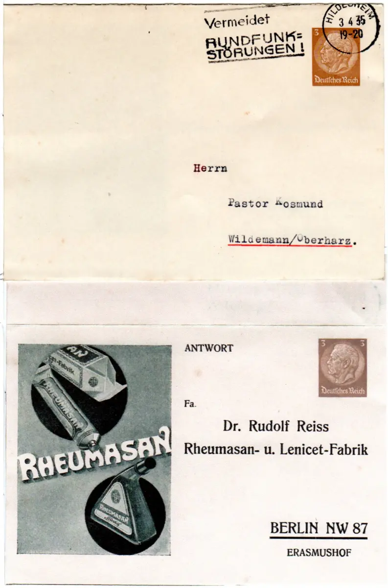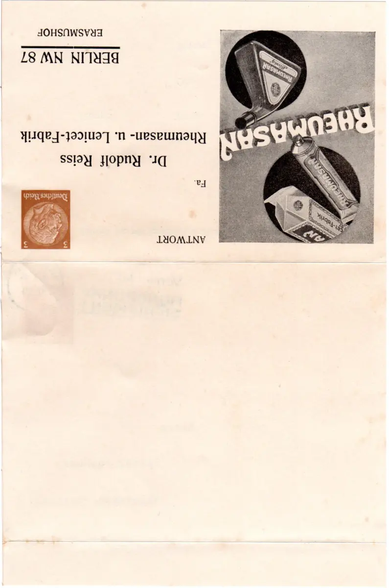 DR 1935, gebr. 3+3 Pf. Privatganzsache-Klappkarte Rheumasan m. Abb.