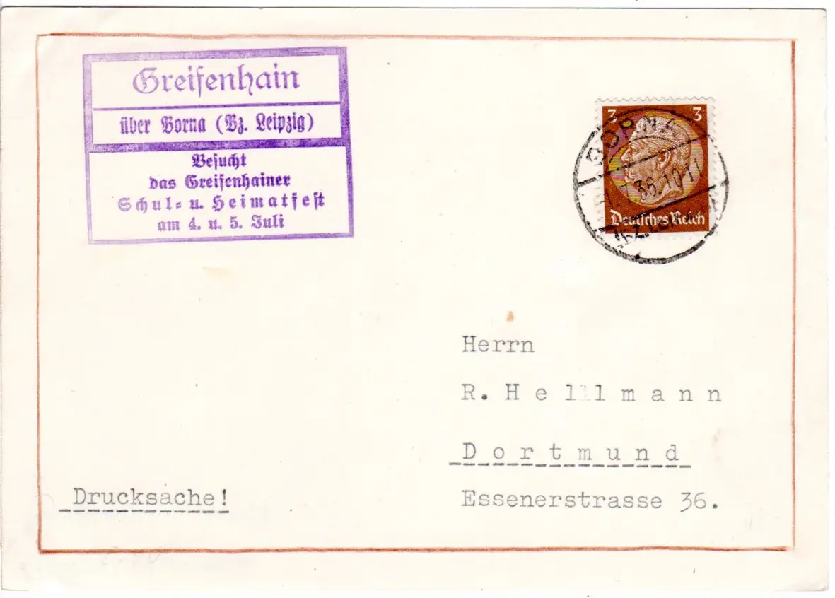 DR 1936, Landpost Stpl. GREIFENHAIN über Borna auf Schul- u. Heimatfest Karte