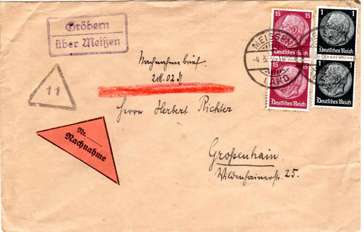 DR 1936, Landpost Stpl. GRÖBERN über Meißen auf Nachnahme Brief m. 4 Marken