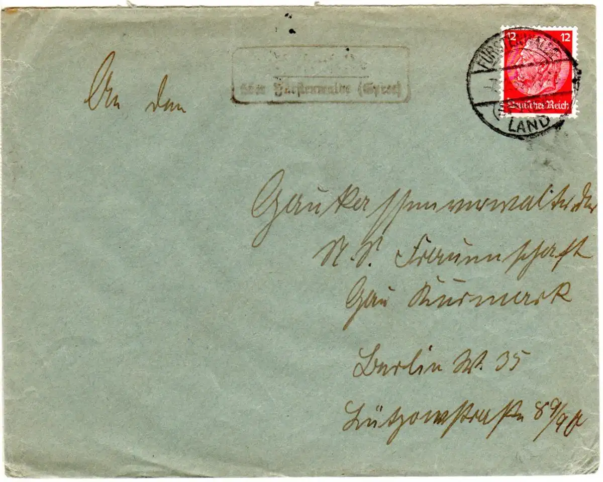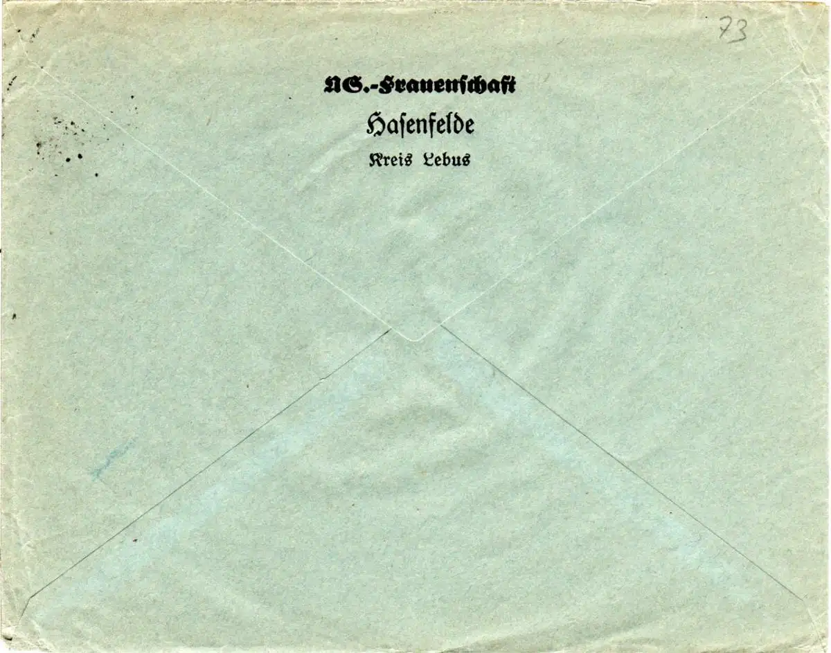 Landpoststellen II-Stempel auf Brief an den Gaukassenverwalter Gau Kurmark m. rücks. Vordruck NS-Frauenschaft Hasenfelde Kreis Lebus.Hasenfelde ist ein Ortsteil der Gemeinde Steinhöfel im Landkreis Oder-Spree.