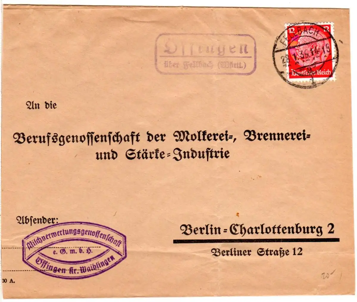 DR 1936, Landpost Stpl. ÖFFINGEN über Fellbach auf Brief m. 12 Pf.