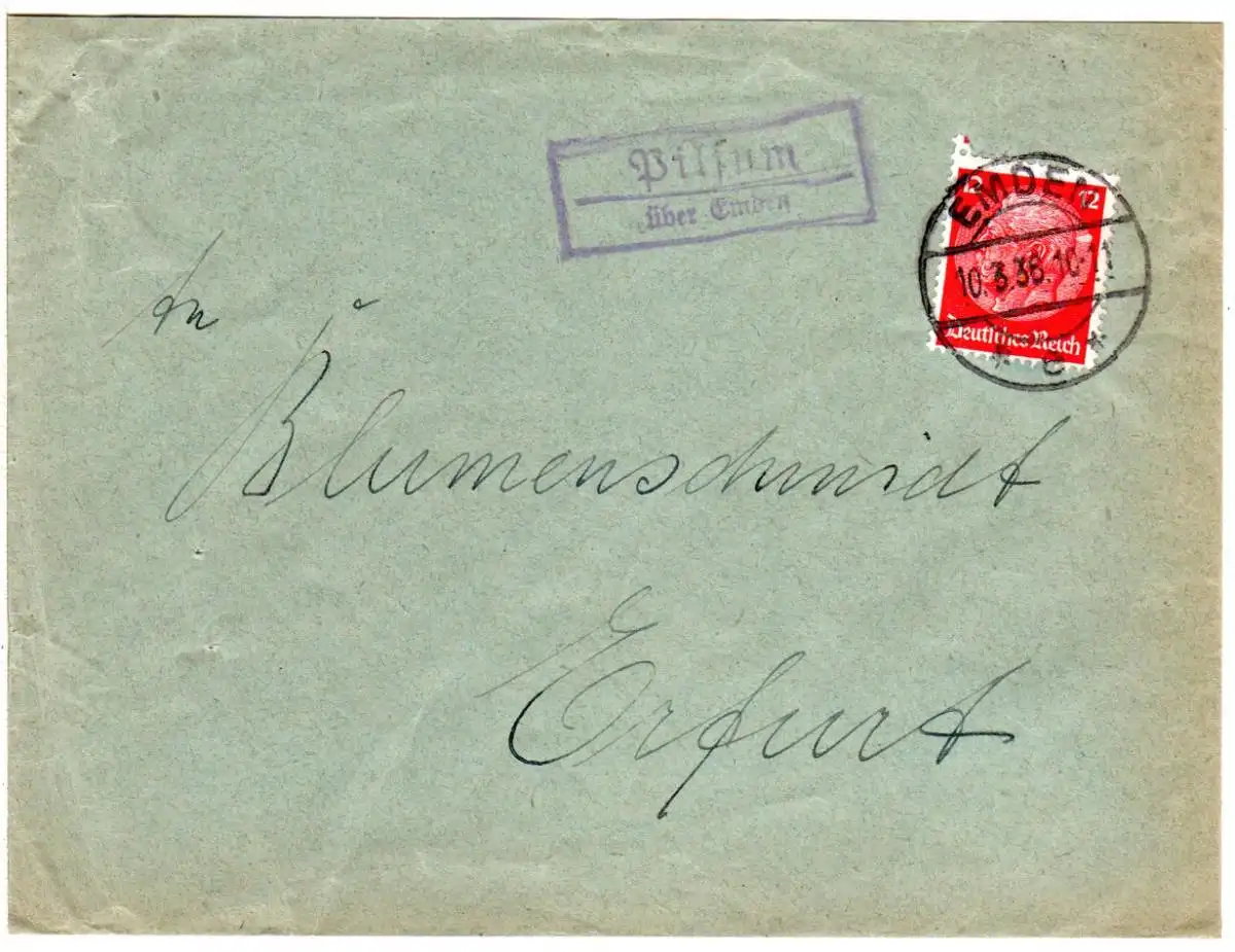 DR 1936, Landpost Stpl. PILSUM über Emden auf Brief m. 12 Pf