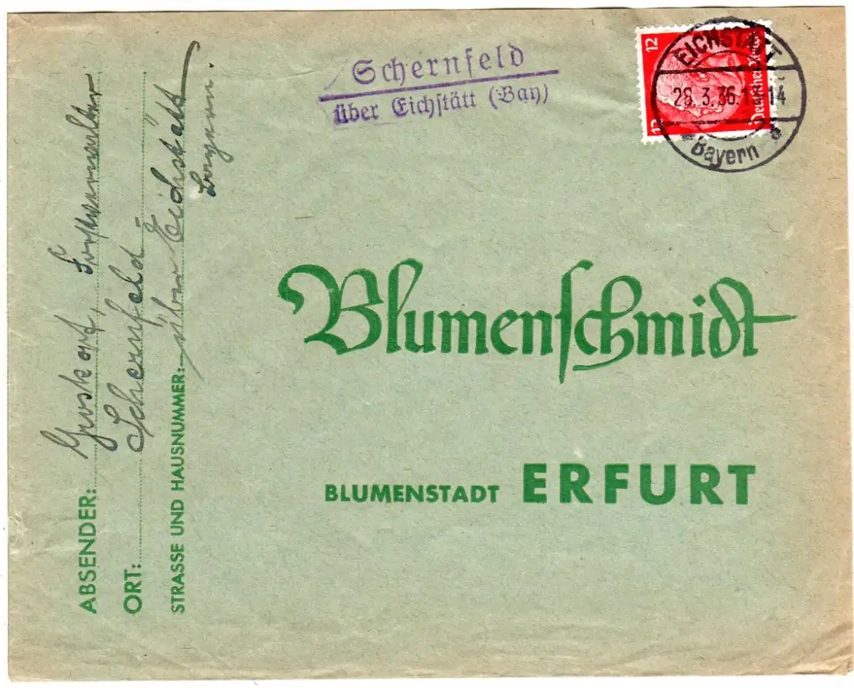 DR 1936, Landpost Stpl. SCHERNFELD über Eichstätt auf Brief m. 12 Pf.