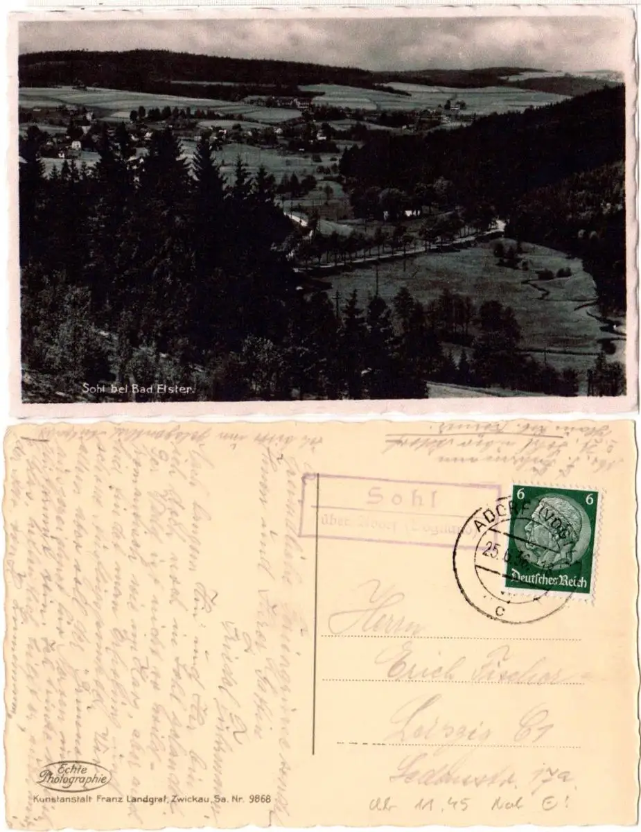 DR 1936, Landpost Stpl. SOHL über Adorf (Vogtland) auf sw-AK m. 6 Pf.
