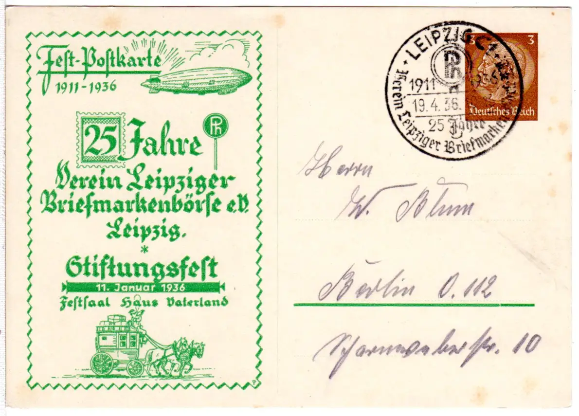 Mit entsprechendem Sonderstempel gebr. Privatganzsache Stiftungsfest 25 Jahre Verein Leipziger Briefmarkenbörse m. Abb. Postkutsche u. Zeppelin.