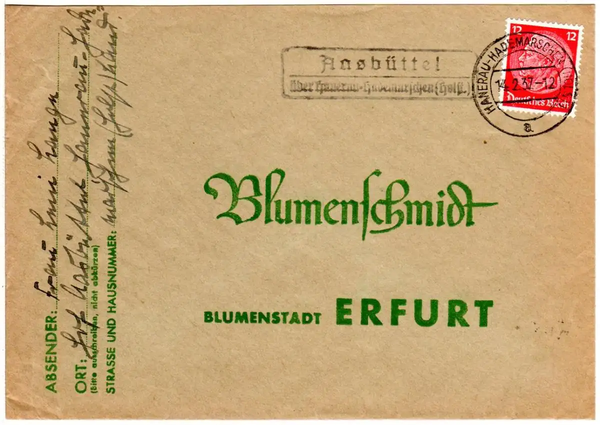 DR 1937, Landpost Stpl. AASBÜTTEL über Hanerau-Hademarschen auf Brief m. 12 Pfg.
