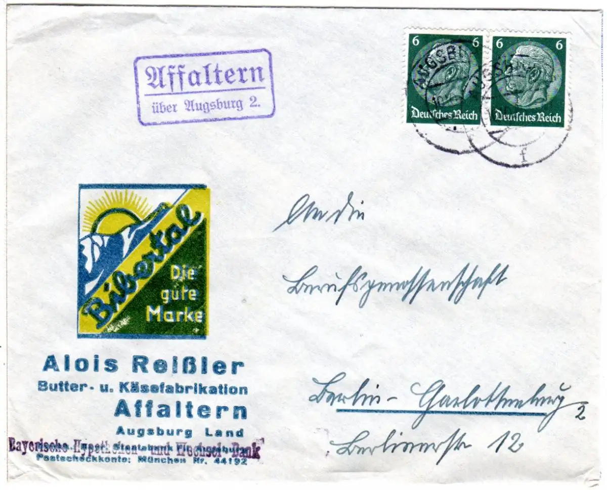 DR 1937, Landpost Stpl. AFFALTERN über Augsburg 2 auf Firmen Brief m. 2x6 Pf.
