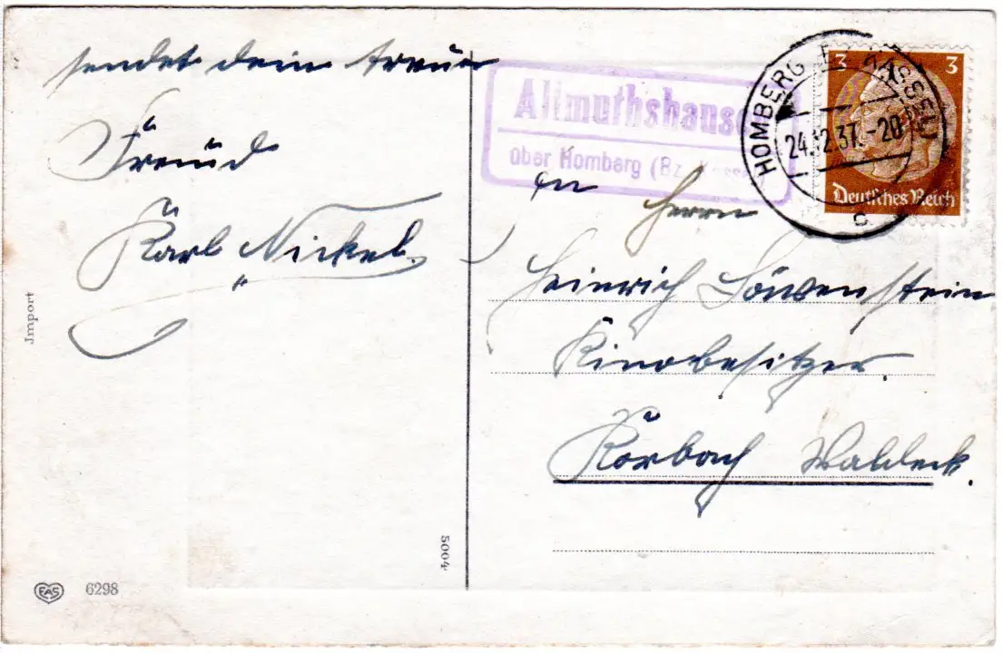 DR 1937, Landpost Stpl. ALLMUTHSHAUSEN über Homberg auf Karte m. 3 Pf.