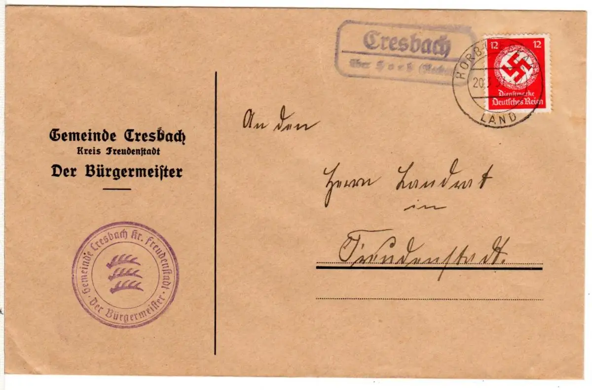 DR 1937, Landpost Stpl. CRESBACH über Horb auf Bürgermeister Brief m. 12 Pf.