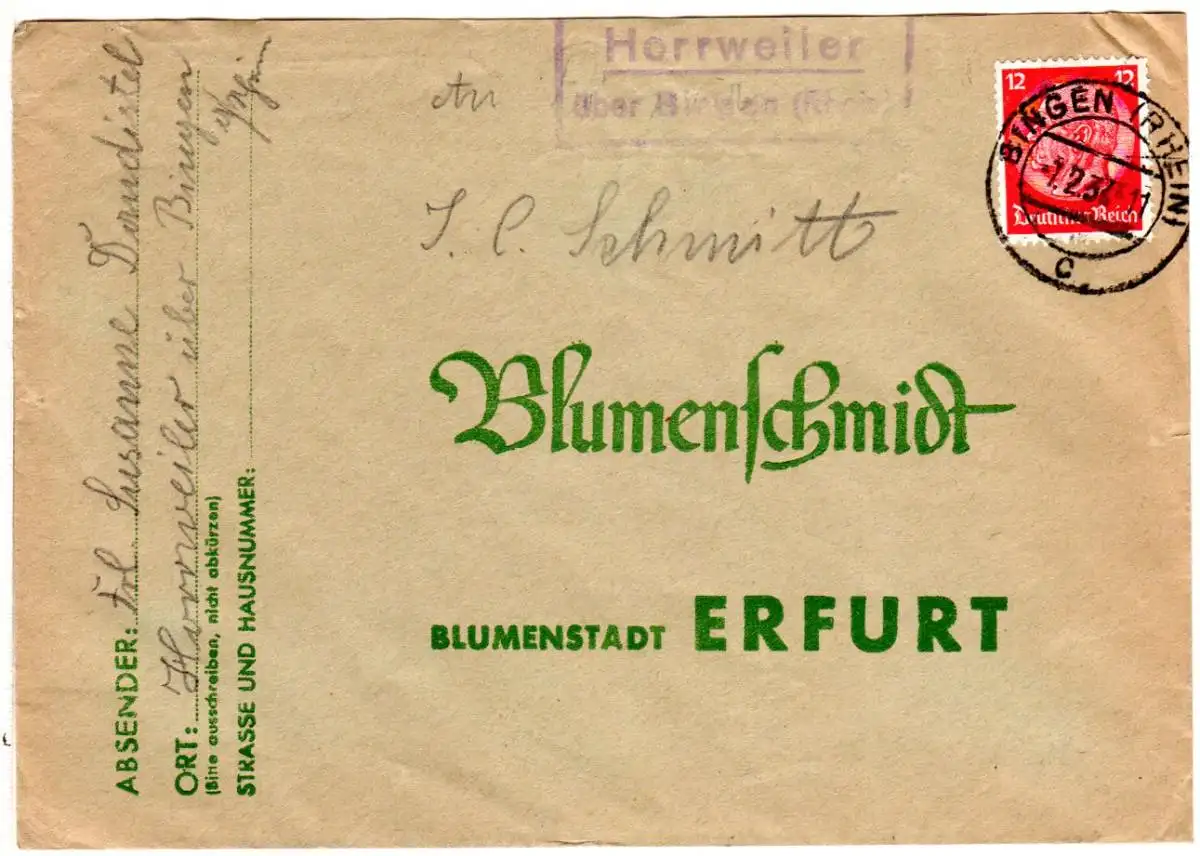 DR 1937, Landpost Stpl. HORRWEILER über Bingen auf Brief m. 12 Pf.