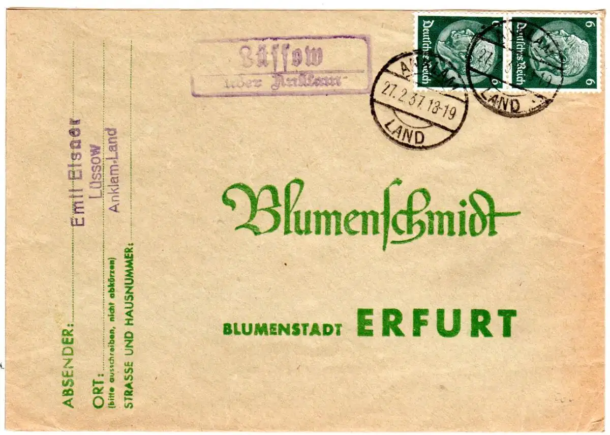 DR 1937, Landpost Stpl. LÜSSOW über Anklam auf Brief m. 2x6 Pfg.