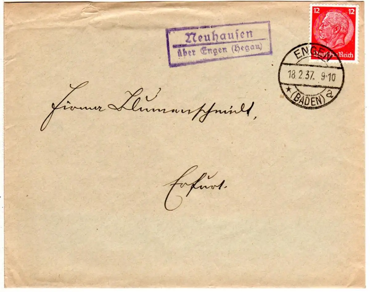 DR 1937, Landpost Stpl. NEUHAUSEN über ENGEN auf Brief m. 12 Pf.