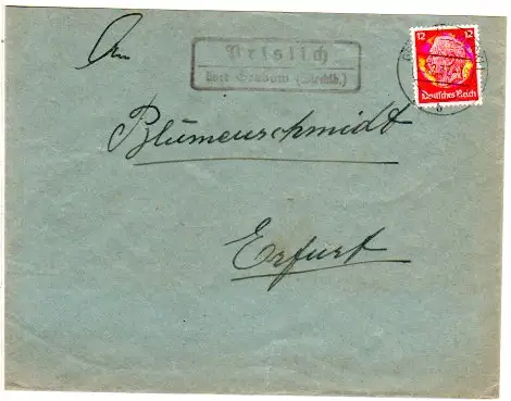DR 1937, Landpost Stpl. PRISLICH über Grabow auf Brief m. 12 Pf.