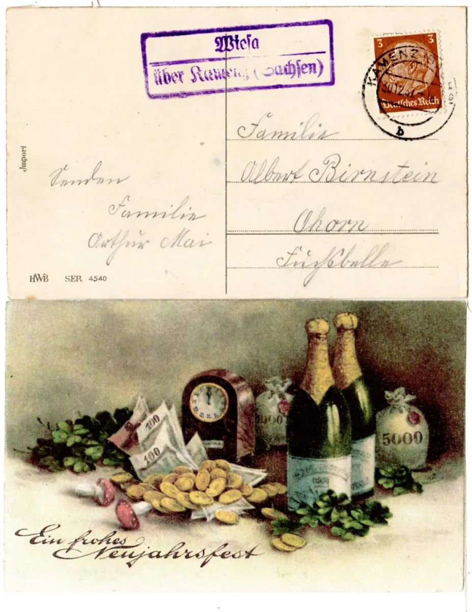 DR 1937, Landpost Stpl. WIESA über Kamenz (Sachsen) auf Neujahrs-AK m. 3 Pf.
