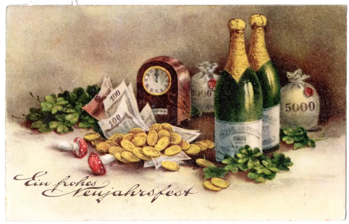 Poststellen II-Stempel auf Neujahrs-Glückwunsch Farb-AK m. Uhr, Pilzen, Sekt, Münzen etc.