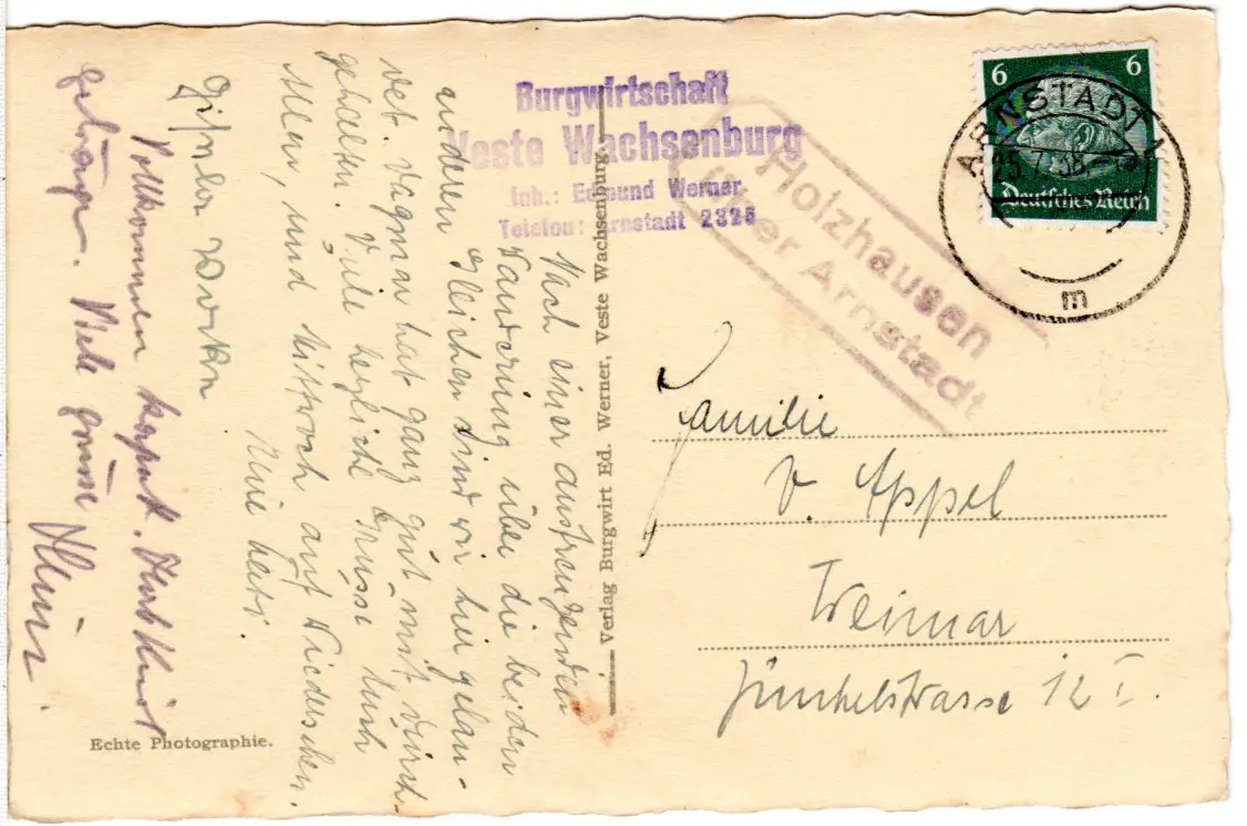 DR 1938, HOLZHAUSEN über Arnstadt, Landpost Stpl. auf sw-AK Veste Wachsenburg
