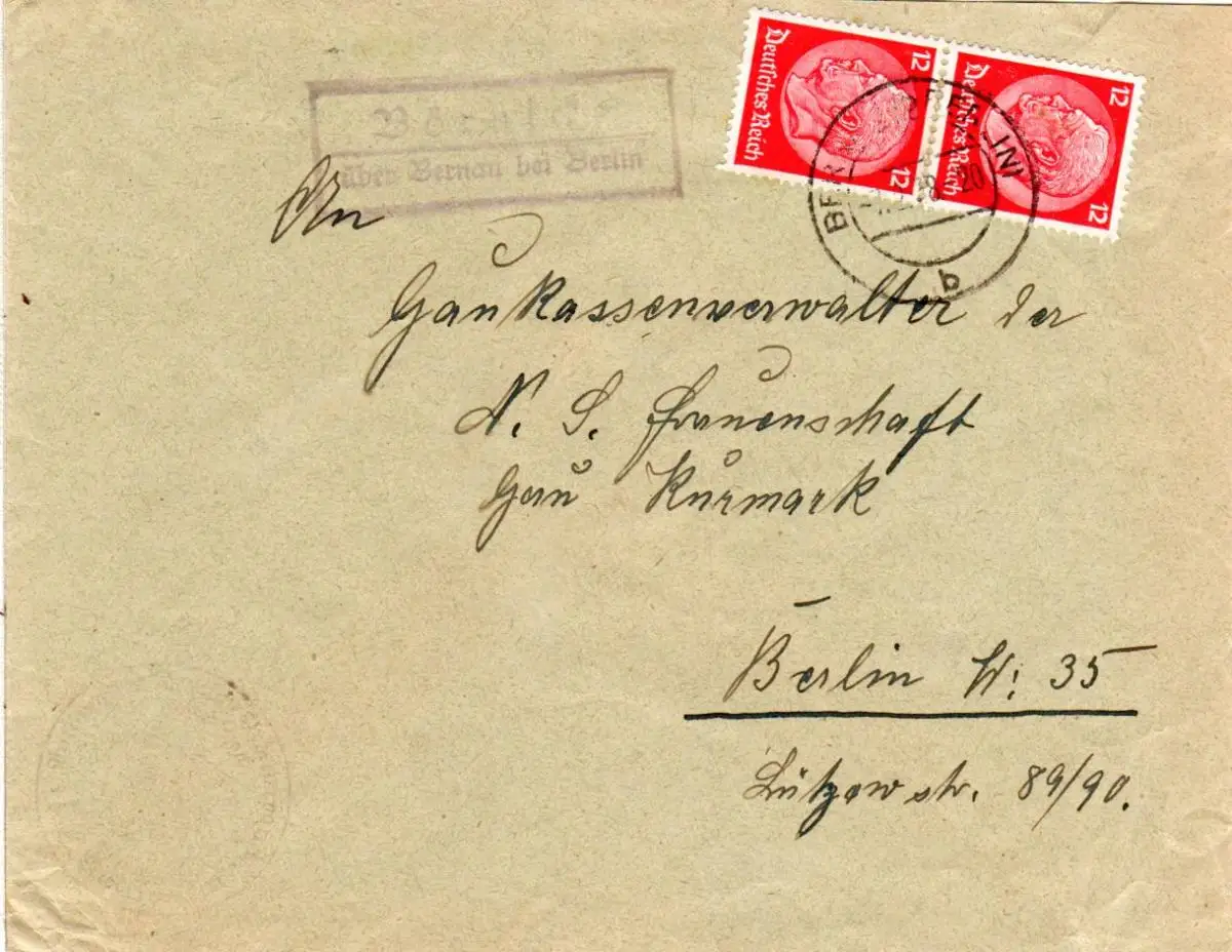 Landpoststellen II-Stempel. Rückseitig Briefstempel Nationalsoz. Deutsche Arbeiterpartei N.S. Frauenschaft Börnicke Kreis Niederbarnim.